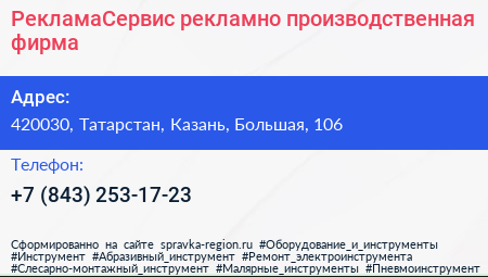РекламаСервис, рекламно-производственная фирма по адресу 420030, Татарстан, Казань, Большая, 106 в дальнейшем Организация, размещена в следующих категориях: