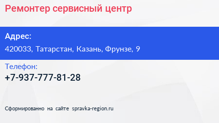 Ремонтер, сервисный центр по адресу 420033, Татарстан, Казань, Фрунзе, 9 в дальнейшем Организация, размещена в следующих категориях: