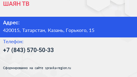 ШАЯН ТВ по адресу 420015, Татарстан, Казань, Горького, 15 в дальнейшем Организация, размещена в следующих категориях: