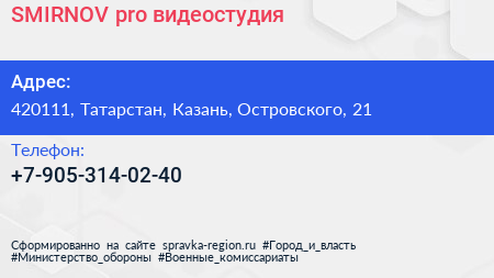 SMIRNOV pro, видеостудия по адресу 420111, Татарстан, Казань, Островского, 21 в дальнейшем Организация, размещена в следующих категориях: