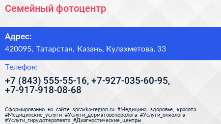 Семейный, фотоцентр по адресу 420095, Татарстан, Казань, Кулахметова, 33 в дальнейшем Организация, размещена в следующих категориях: