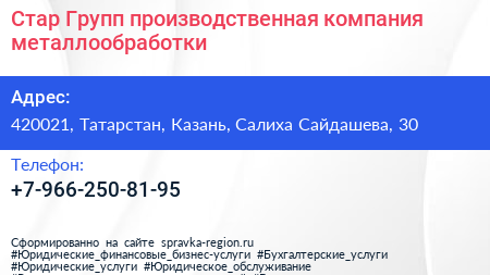 Стар Групп, производственная компания металлообработки по адресу 420021, Татарстан, Казань, Салиха Сайдашева, 30 в дальнейшем Организация, размещена в следующих категориях: