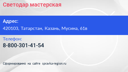 Светодар, мастерская по адресу 420103, Татарстан, Казань, Мусина, 61в в дальнейшем Организация, размещена в следующих категориях: