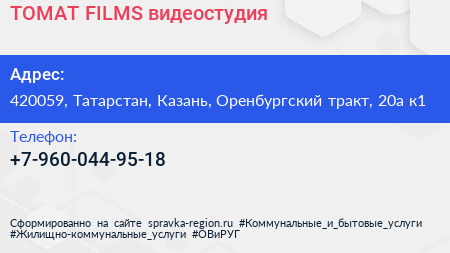TOMAT FILMS, видеостудия по адресу 420059, Татарстан, Казань, Оренбургский тракт, 20а к1 в дальнейшем Организация, размещена в следующих категориях: