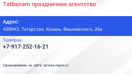 Tatbairam, праздничное агентство по адресу 420043, Татарстан, Казань, Вишневского, 26а в дальнейшем Организация, размещена в следующих категориях:
