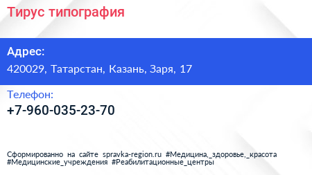 Тирус, типография по адресу 420029, Татарстан, Казань, Заря, 17 в дальнейшем Организация, размещена в следующих категориях: