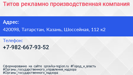 Титов, рекламно-производственная компания по адресу 420098, Татарстан, Казань, Шоссейная, 112 к2 в дальнейшем Организация, размещена в следующих категориях: