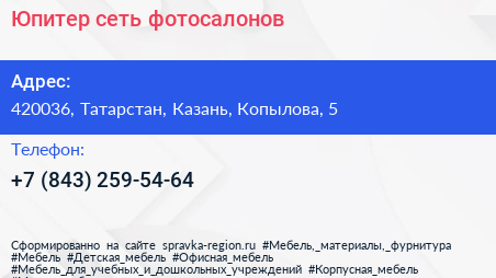 Юпитер, сеть фотосалонов по адресу 420036, Татарстан, Казань, Копылова, 5 в дальнейшем Организация, размещена в следующих категориях: