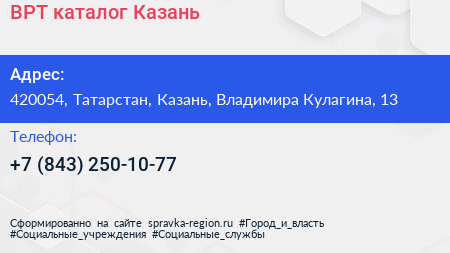 ВРТ-каталог Казань по адресу 420054, Татарстан, Казань, Владимира Кулагина, 13 в дальнейшем Организация, размещена в следующих категориях:
