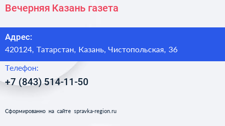 Вечерняя Казань, газета по адресу 420124, Татарстан, Казань, Чистопольская, 36 в дальнейшем Организация, размещена в следующих категориях: