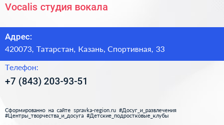 Vocalis, студия вокала по адресу 420073, Татарстан, Казань, Спортивная, 33 в дальнейшем Организация, размещена в следующих категориях: