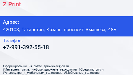Z-Print по адресу 420103, Татарстан, Казань, проспект Ямашева, 48Б в дальнейшем Организация, размещена в следующих категориях: