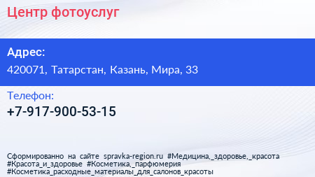 Центр фотоуслуг по адресу 420071, Татарстан, Казань, Мира, 33 в дальнейшем Организация, размещена в следующих категориях: