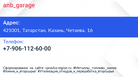 anb_garage по адресу 421001, Татарстан, Казань, Четаева, 16 в дальнейшем Организация, размещена в следующих категориях: