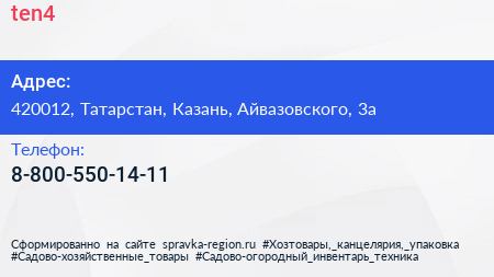 ten4 по адресу 420012, Татарстан, Казань, Айвазовского, 3а в дальнейшем Организация, размещена в следующих категориях: