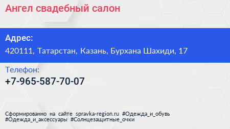 Ангел, свадебный салон по адресу 420111, Татарстан, Казань, Бурхана Шахиди, 17 в дальнейшем Организация, размещена в следующих категориях: