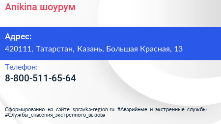 Anikina, шоурум по адресу 420111, Татарстан, Казань, Большая Красная, 13 в дальнейшем Организация, размещена в следующих категориях: