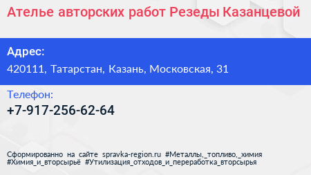 Ателье авторских работ Резеды Казанцевой по адресу 420111, Татарстан, Казань, Московская, 31 в дальнейшем Организация, размещена в следующих категориях: