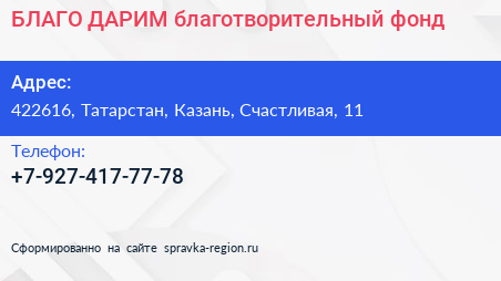 БЛАГО ДАРИМ, благотворительный фонд по адресу 422616, Татарстан, Казань, Счастливая, 11 в дальнейшем Организация, размещена в следующих категориях: