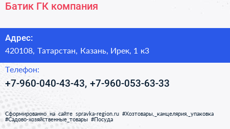 Батик ГК, компания по адресу 420108, Татарстан, Казань, Ирек, 1 к3 в дальнейшем Организация, размещена в следующих категориях: