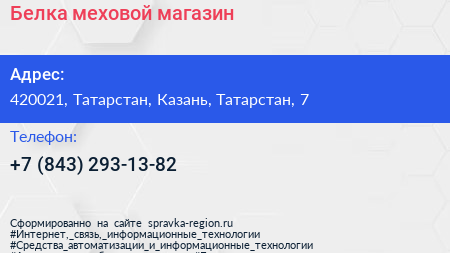 Белка, меховой магазин по адресу 420021, Татарстан, Казань, Татарстан, 7 в дальнейшем Организация, размещена в следующих категориях:
