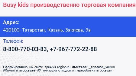 Busy kids, производственно-торговая компания по адресу 420100, Татарстан, Казань, Закиева, 9а в дальнейшем Организация, размещена в следующих категориях: