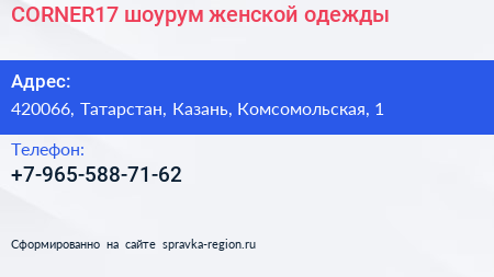 CORNER17, шоурум женской одежды по адресу 420066, Татарстан, Казань, Комсомольская, 1 в дальнейшем Организация, размещена в следующих категориях: