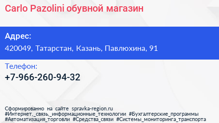 Carlo Pazolini, обувной магазин по адресу 420049, Татарстан, Казань, Павлюхина, 91 в дальнейшем Организация, размещена в следующих категориях: