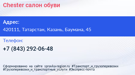 Chester, салон обуви по адресу 420111, Татарстан, Казань, Баумана, 45 в дальнейшем Организация, размещена в следующих категориях: