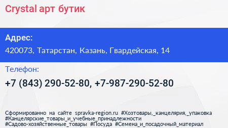 Crystal, арт-бутик по адресу 420073, Татарстан, Казань, Гвардейская, 14 в дальнейшем Организация, размещена в следующих категориях: