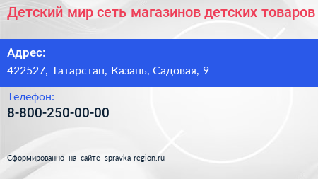 Детский мир, сеть магазинов детских товаров по адресу 422527, Татарстан, Казань, Садовая, 9 в дальнейшем Организация, размещена в следующих категориях: