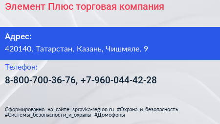 Элемент Плюс, торговая компания по адресу 420140, Татарстан, Казань, Чишмяле, 9 в дальнейшем Организация, размещена в следующих категориях: