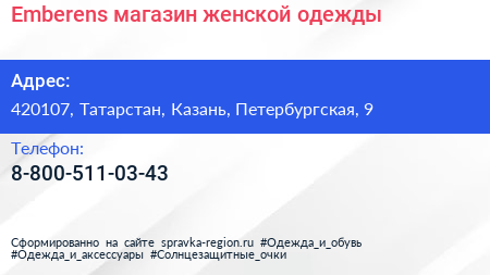 Emberens, магазин женской одежды по адресу 420107, Татарстан, Казань, Петербургская, 9 в дальнейшем Организация, размещена в следующих категориях: