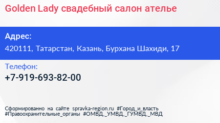 Golden Lady, свадебный салон-ателье по адресу 420111, Татарстан, Казань, Бурхана Шахиди, 17 в дальнейшем Организация, размещена в следующих категориях: