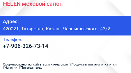 HELEN, меховой салон по адресу 420021, Татарстан, Казань, Чернышевского, 43/2 в дальнейшем Организация, размещена в следующих категориях: