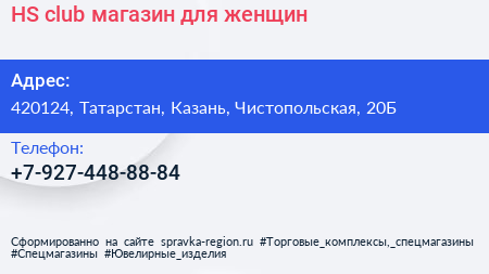 HS club, магазин для женщин по адресу 420124, Татарстан, Казань, Чистопольская, 20Б в дальнейшем Организация, размещена в следующих категориях: