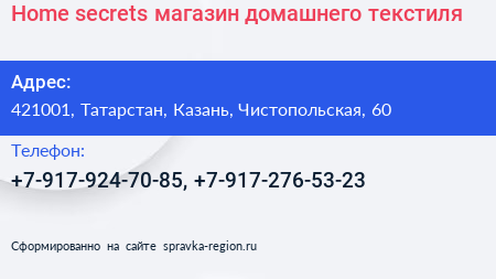 Home secrets, магазин домашнего текстиля по адресу 421001, Татарстан, Казань, Чистопольская, 60 в дальнейшем Организация, размещена в следующих категориях: