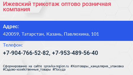 Ижевский трикотаж, оптово-розничная компания по адресу 420059, Татарстан, Казань, Павлюхина, 101 в дальнейшем Организация, размещена в следующих категориях: