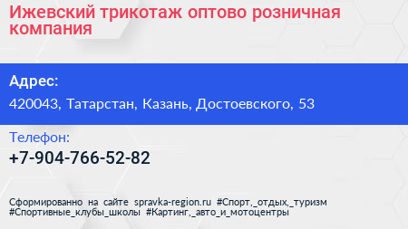 Ижевский трикотаж, оптово-розничная компания по адресу 420043, Татарстан, Казань, Достоевского, 53 в дальнейшем Организация, размещена в следующих категориях:
