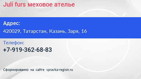 Juli furs, меховое ателье по адресу 420029, Татарстан, Казань, Заря, 16 в дальнейшем Организация, размещена в следующих категориях: