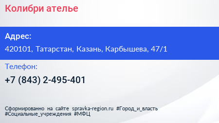 Колибри, ателье по адресу 420101, Татарстан, Казань, Карбышева, 47/1 в дальнейшем Организация, размещена в следующих категориях: