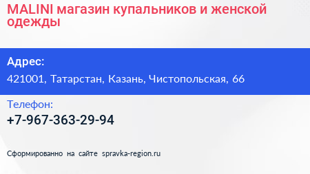 MALINI, магазин купальников и женской одежды по адресу 421001, Татарстан, Казань, Чистопольская, 66 в дальнейшем Организация, размещена в следующих категориях: