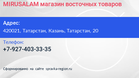 MIRUSALAM, магазин восточных товаров по адресу 420021, Татарстан, Казань, Татарстан, 20 в дальнейшем Организация, размещена в следующих категориях: