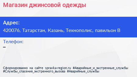 Магазин джинсовой одежды по адресу 420076, Татарстан, Казань, Технополис, павильон В в дальнейшем Организация, размещена в следующих категориях:
