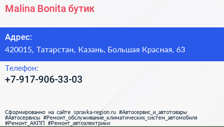 Malina Bonita, бутик по адресу 420015, Татарстан, Казань, Большая Красная, 63 в дальнейшем Организация, размещена в следующих категориях: