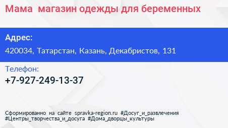 Мама+, магазин одежды для беременных по адресу 420034, Татарстан, Казань, Декабристов, 131 в дальнейшем Организация, размещена в следующих категориях: