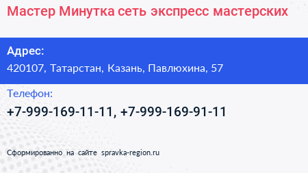 Мастер Минутка, сеть экспресс-мастерских по адресу 420107, Татарстан, Казань, Павлюхина, 57 в дальнейшем Организация, размещена в следующих категориях: