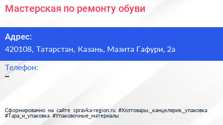 Мастерская по ремонту обуви по адресу 420108, Татарстан, Казань, Мазита Гафури, 2а в дальнейшем Организация, размещена в следующих категориях: