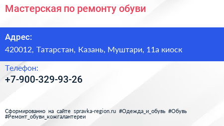 Мастерская по ремонту обуви по адресу 420012, Татарстан, Казань, Муштари, 11а киоск в дальнейшем Организация, размещена в следующих категориях: