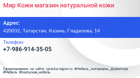 Мир Кожи, магазин натуральной кожи по адресу 420032, Татарстан, Казань, Гладилова, 14 в дальнейшем Организация, размещена в следующих категориях: